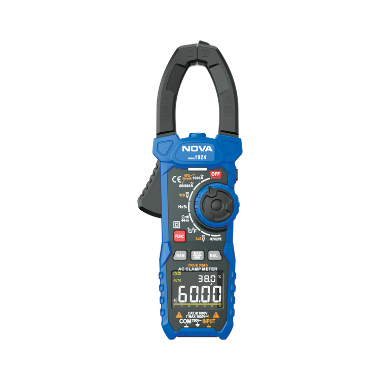 مولتیمتر کلمپی دیجیتال نووا مدل 1924 ابزاری دقیق و چندمنظوره برای اندازهگیری جریان AC تا 1000 آمپر، ولتاژ AC، مقاومت، فرکانس، دیود، خازن و دما است. این دستگاه با فک بازشونده تا قطر 35 میلیمتر، قابلیت تست جریان در کابلها و سیمهای ضخیم را فراهم میآورد. همچنین، مجهز به تستر ولتاژ غیرتماسی (NCV) و فازمتر تماسی بوده و سیستم محافظت در برابر اضافه بار، امنیت بالای کاربر را تضمین میکند. ورودی با امپدانس پایین از بروز خطای ناشی از ولتاژهای القایی جلوگیری کرده و فیلتر پایینگذر (LPF) دقت اندازهگیری سیگنالهای موتور و ترانسفورماتور را افزایش میدهد.