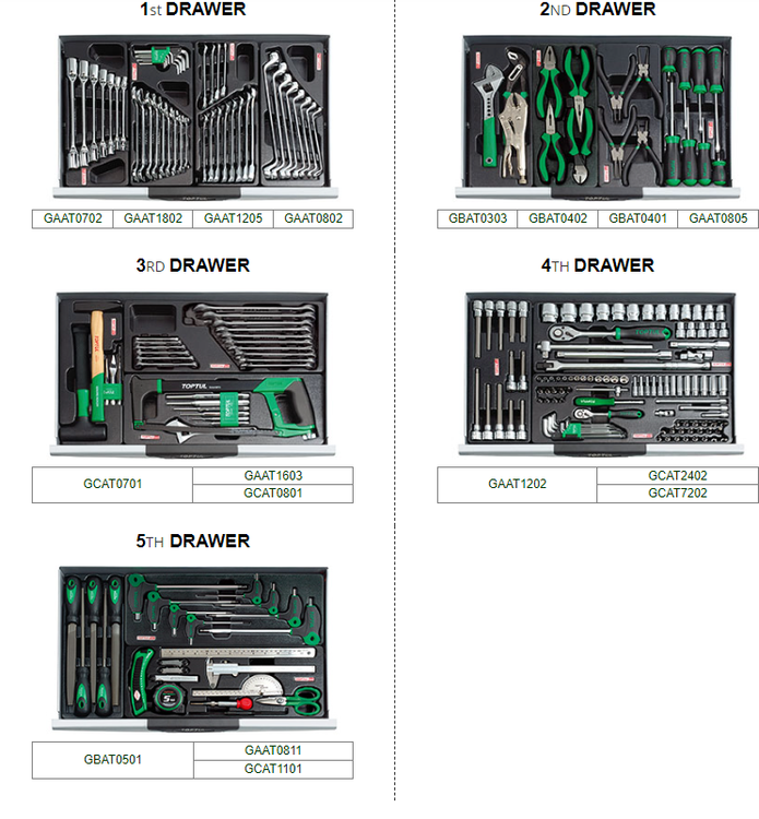 محتویات کشو 1 کد ( GAAT1802) آچار دو سر تخت : 19*18, 17*16, 15*14 , 13*12, 11*10, 9*8, 7*6, 24*22, 22*20 آلن کوتاه سری :10, 8,6,5,4,3,2/5,2,1/5
