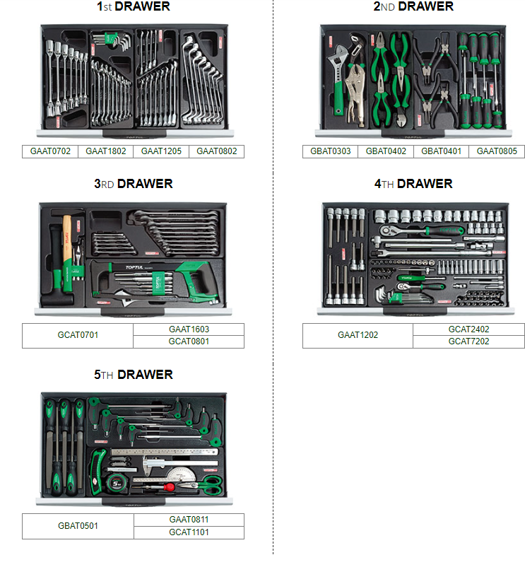 محتویات کشو 1 کد ( GAAT1802) آچار دو سر تخت : 19*18, 17*16, 15*14 , 13*12, 11*10, 9*8, 7*6, 24*22, 22*20 آلن کوتاه سری :10, 8,6,5,4,3,2/5,2,1/5