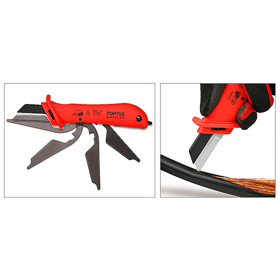 چاقو کابل بر با تیغه قابل تعویض تاپ تول مناسب برای جدا کردن سیم ها و کابل های ضخیم ، طراحی تیغه مستقیم از جنس فولاد ضد زنگ و سخت شده دارای گارد محافظ تیغه داخلی، طراحی دسته به شکل ارگونومیک و عایق بر اساس IEC 60900 می باشد.