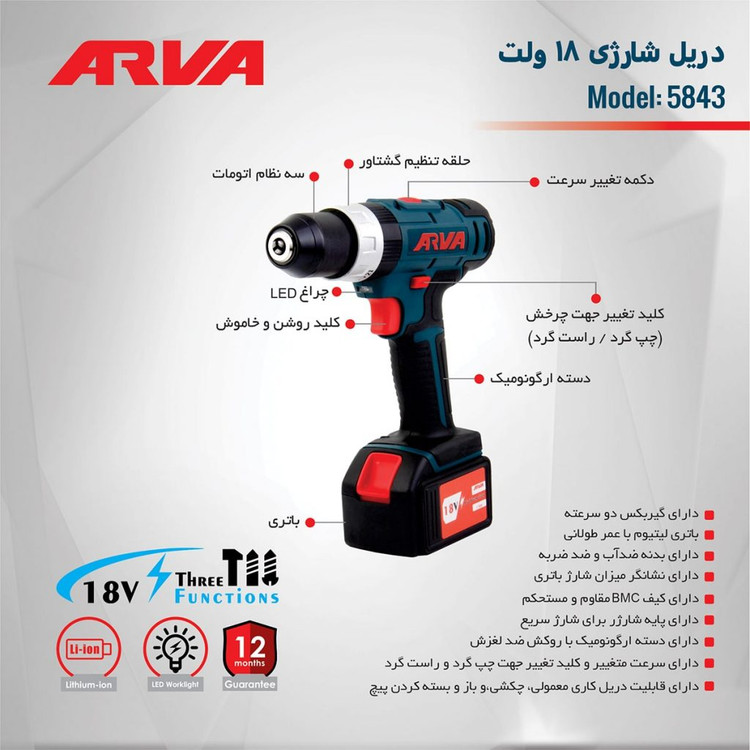 دریل شارژی 18 ولت چکشی مدل 5843-TDT2003H آروا